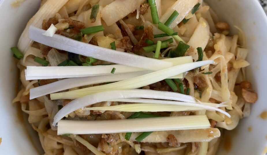 In a bowl, mixed together peanut butter, chilli oil, sesame oil, soy sauce, honey, rice vinegar, until smooth. Add a tablespoon or two of warm water if it’s too thick — you want a consistency that allow you to mixed it with the noodles.